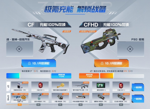 4、参与方式:CFer每日登录CF或CFHD极氪获得10%充能进度,分享活动并让好友成功登录也可获得10%充能进度,当充能进度达到100%时即可在10月1日开始领取全新源英雄级武器雷神-极氪汽车,且过程中每积累10%进度就能领取一件道具。