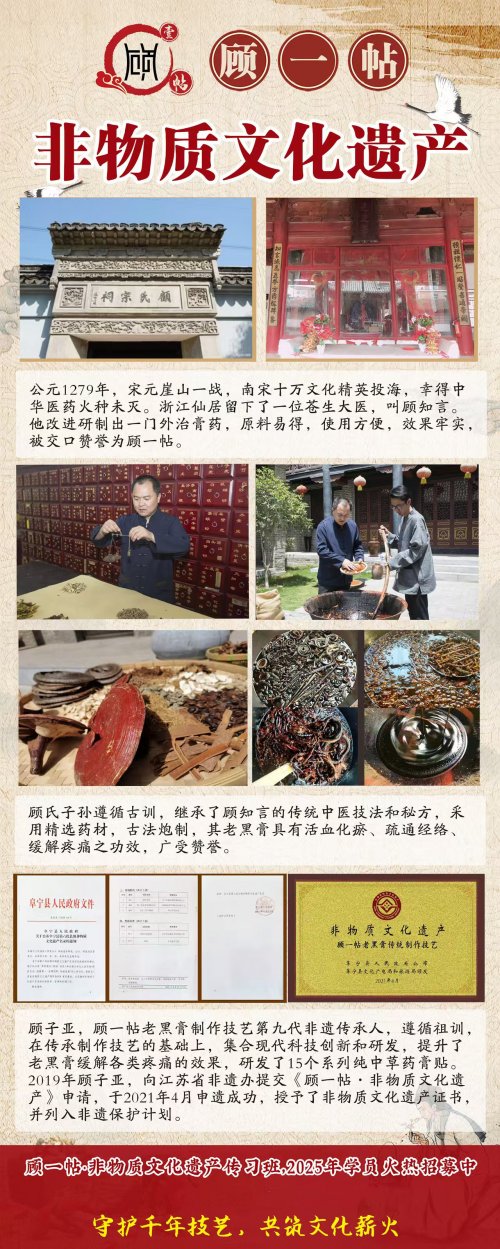 在中华传统医药的璀璨星河中,有一抹穿越时空的黑亮光泽,它源自南宋,历经九代匠心传承,于2021年正式载入阜宁县第六批县级非物质文化遗产名录(编号:III-2)。它,就是 顾一帖·老黑膏——不仅是缓解疼痛的良方,更是一份流动的、有温度的文化遗产。