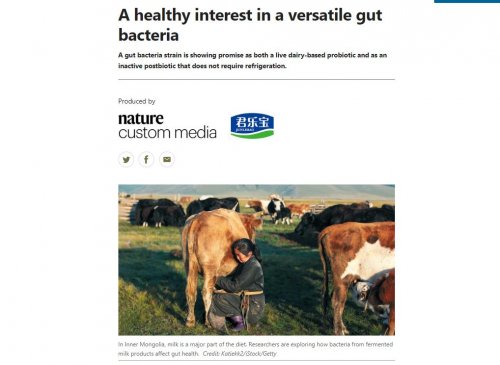 近日,国际顶级学术期刊《自然》(Nature)发表了题为《A healthy interest in a versatile gut bacteria》的研究文章,报道了君乐宝乳业集团在益生菌领域取得的最新科研进展。该成果体现了君乐宝在功能性菌株研究方面的重要突破,表明其科研实力已获得国际学术界的高度认可,也为企业持续推动科技创新、深化产学研融合提供了有力支撑。