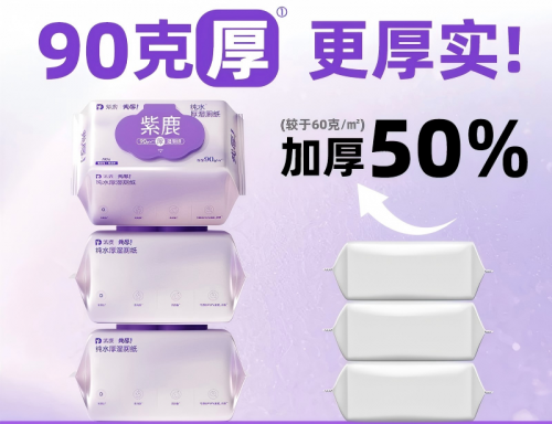 行业数据显示,当前湿厕纸市场主流产品的基布克重集中于60g/㎡左右。紫鹿推出的厚湿厕纸,将这一关键指标提升至90g/㎡,厚度增加50%。这一看似简单的物理参数变化,带来了产品功能的本质差异。