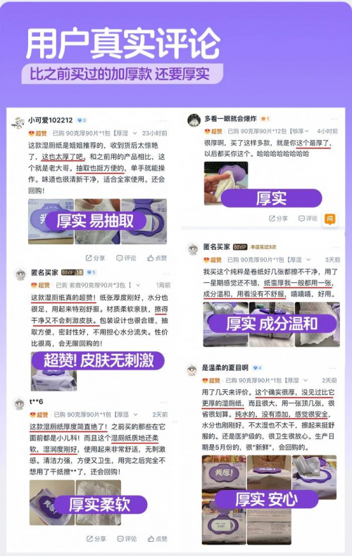 新品类的生命力,需要市场数据验证。根据品牌方提供的近期销售数据,该厚湿厕纸产品的好评率维持在98%以上,核心用户复购率超过50%。在电商平台,大量用户评价聚焦于“厚实”、“安心”、“一张就够”等关键词。多位消费者向记者反馈,尤其是在女性生理期、家庭育儿等对清洁有更高要求的场景下,产品的厚实特性带来了显著的心理安全感。